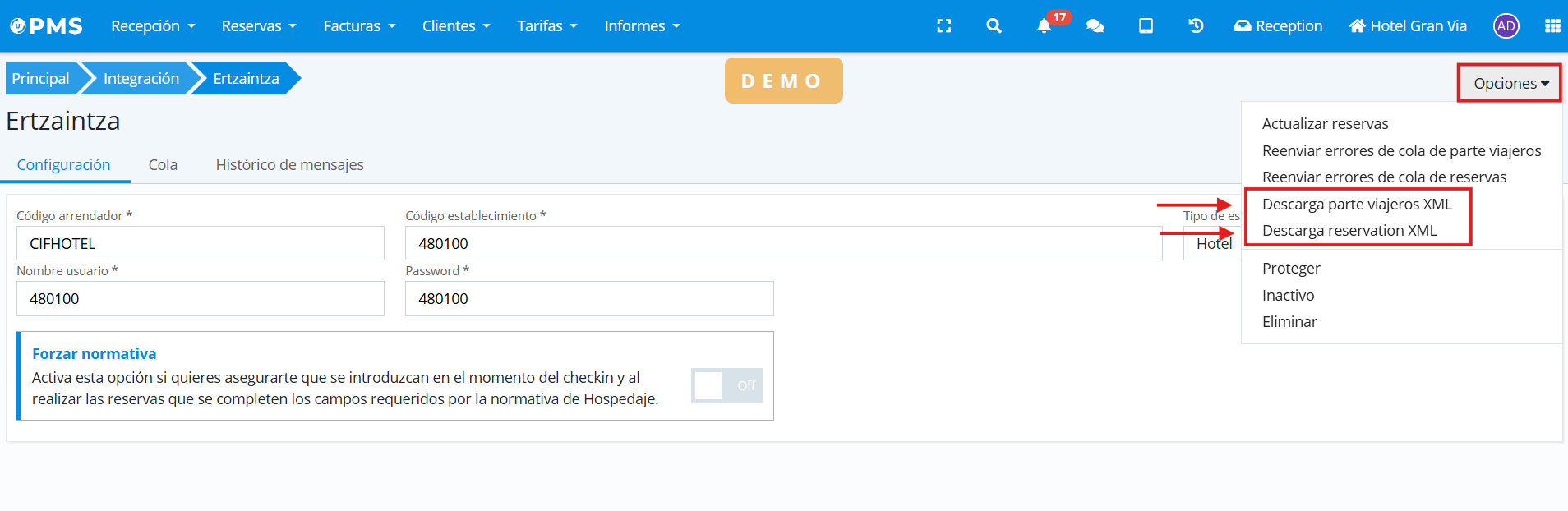Une fois la configuration réalisée, depuis la section "Options", il sera possible de télécharger les fichiers de déclaration des voyageurs et des réservations pour pouvoir les télécharger sur le site de l'Ertzaintza.