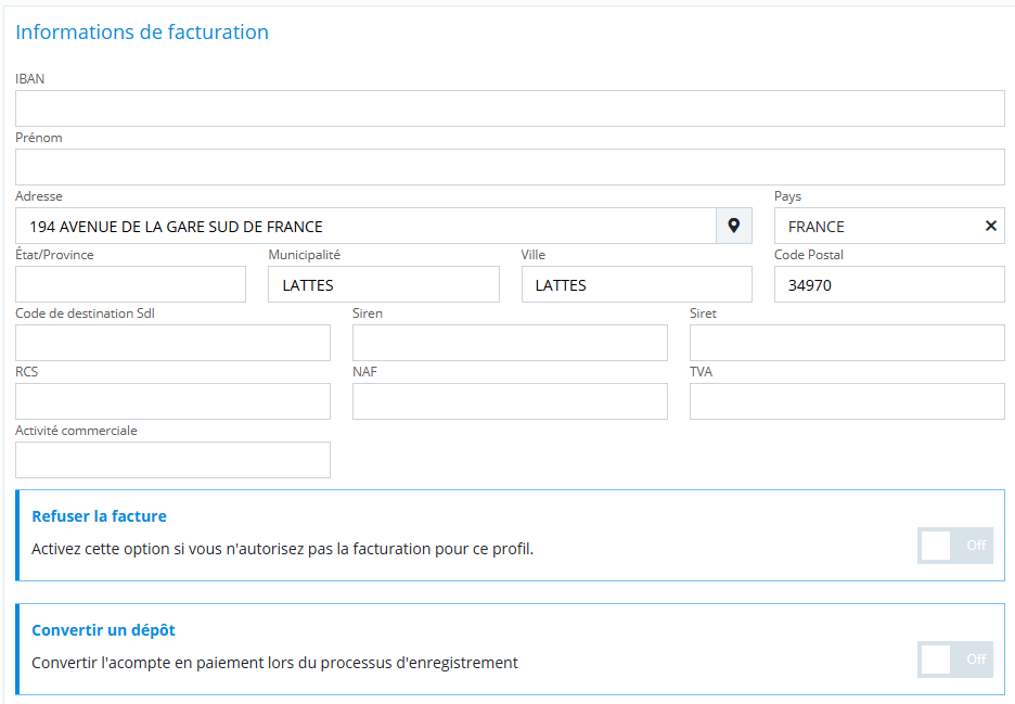Si l’adresse de facturation diffère de l’adresse principale, elle peut être définie dans cette section.
