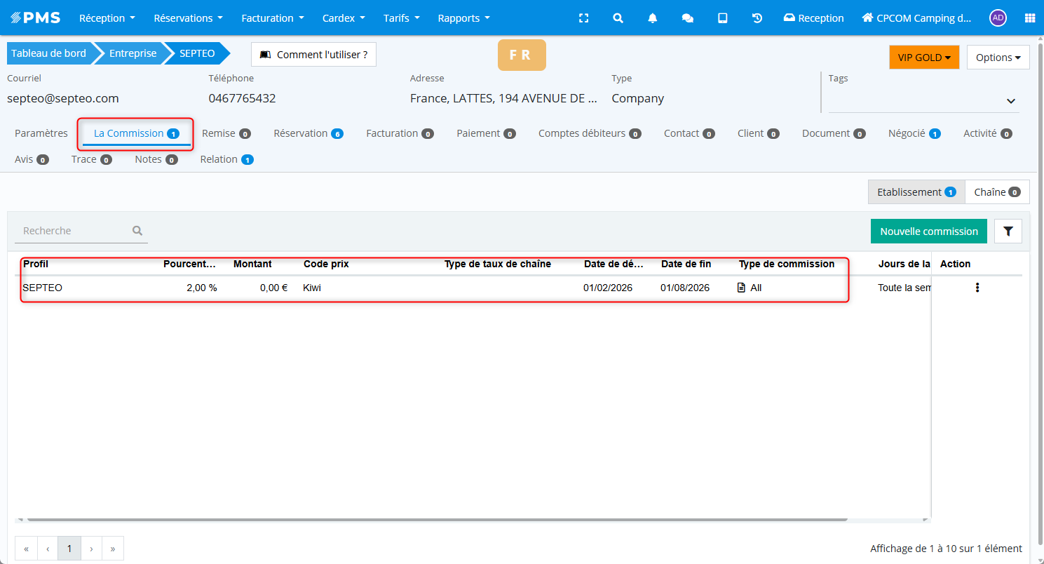 Depuis le menu Options, il est possible de créer une commission spécifique pour l’entreprise.