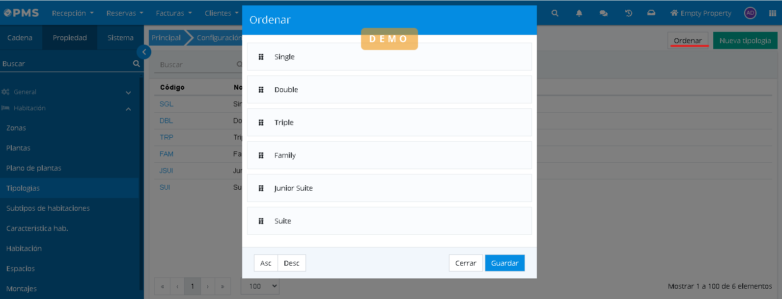 Si nous voulons changer l'ordre des hébergements dans la consultation de disponibilité, nous irons dans la configuration de la propriété>typologies et nous changerons l'ordre des produits via "Trier"