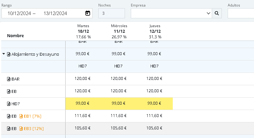 Imaginez que vous souhaitez vérifier le meilleur tarif disponible pour l'hébergement supérieur et une occupation de 2 adultes. Comme nous pouvons le voir ci-dessous, le meilleur prix disponible pour les 3 nuits provient du tarif "HD7" et c’est ce qui est affiché dans la ligne principale.
