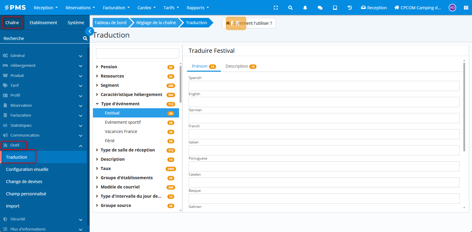 Configuration de la chaîne > Outils > Traductions
