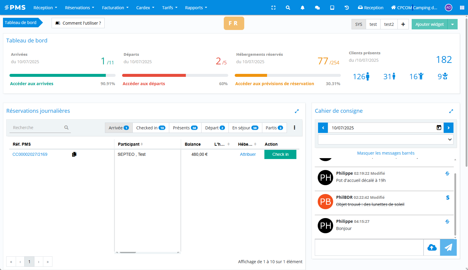 Affichage des arrivées et départs du jour pour une gestion rapide.