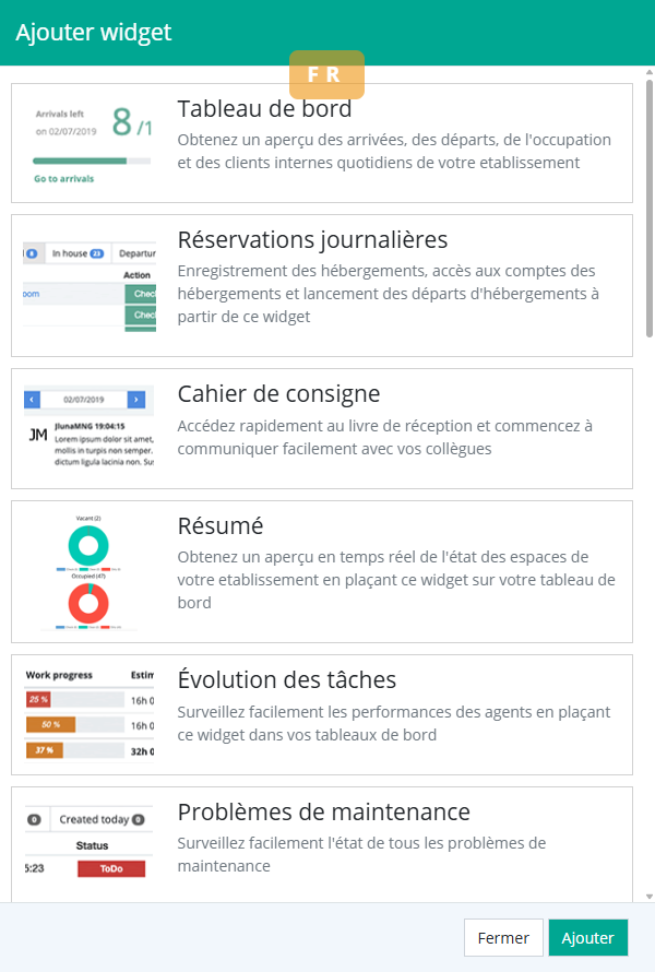 Ulyses Suite intègre un tableau de bord par défaut comprenant différents widgets liés aux réservations et aux opérations quotidiennes.
