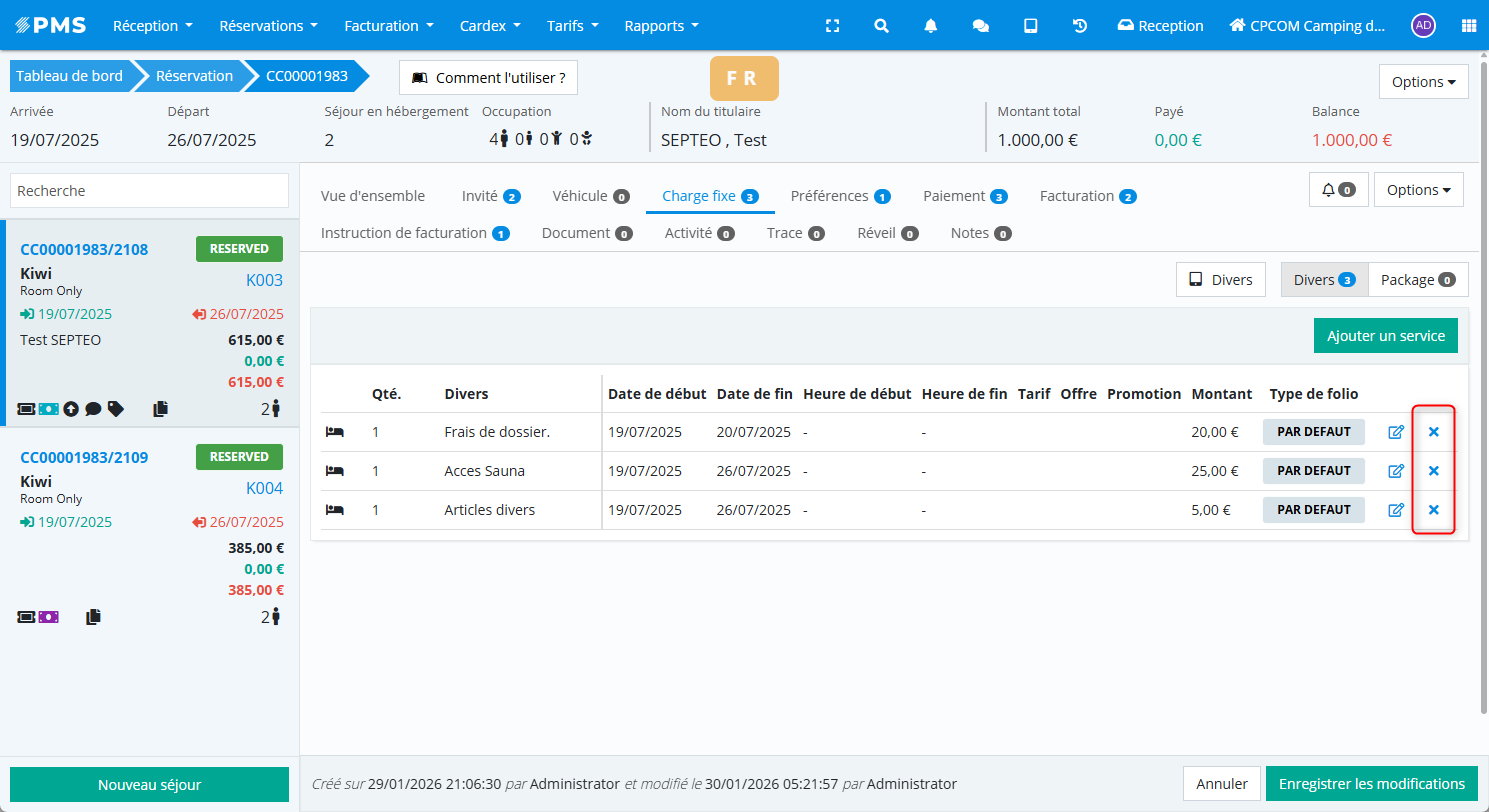 Pour éviter les erreurs de facturation, vérifiez systématiquement si un service doit être facturé par séjour ou par occupant avant de l’ajouter à la réservation.