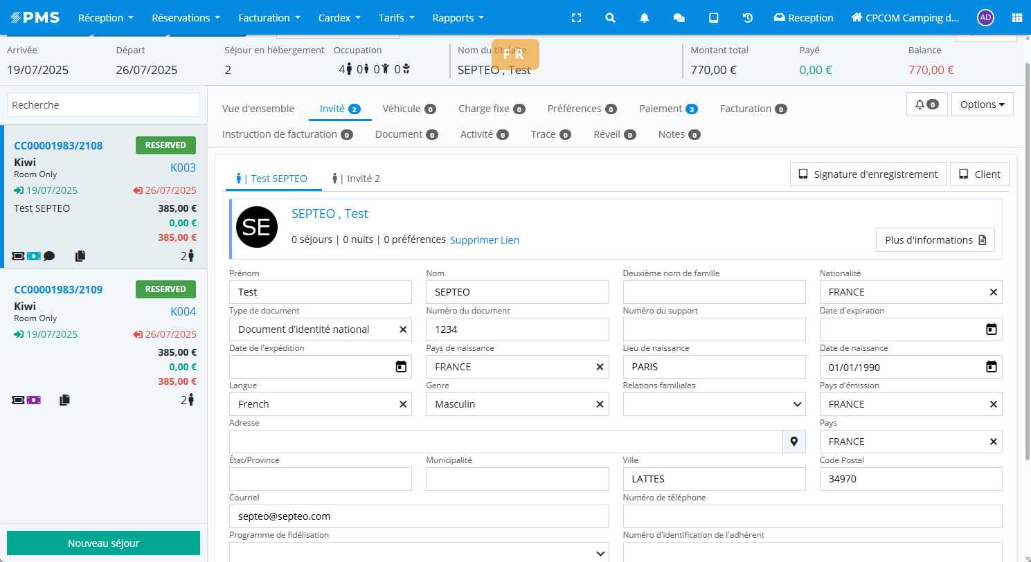 Dans la majorité des cas, les informations des participants sont complétées au moment du check-in. Par défaut, Ulyses Suite enregistre le titulaire de la réservation comme premier participant du premier séjour. Ces informations peuvent ensuite être modifiées ou complétées.