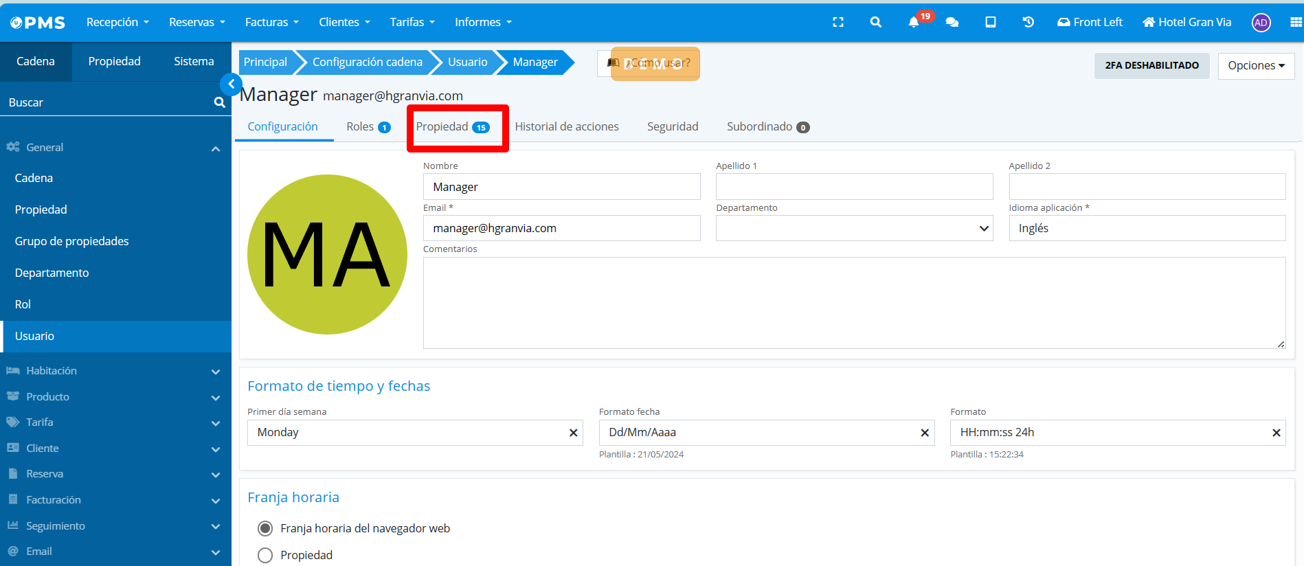 Un utilisateur dans Ulyses Suite peut accéder à un ou plusieurs établissements depuis le menu supérieur. Pour ajouter ou supprimer des propriétés à un utilisateur, cela se fait depuis l'onglet Propriétés dans la fiche utilisateur