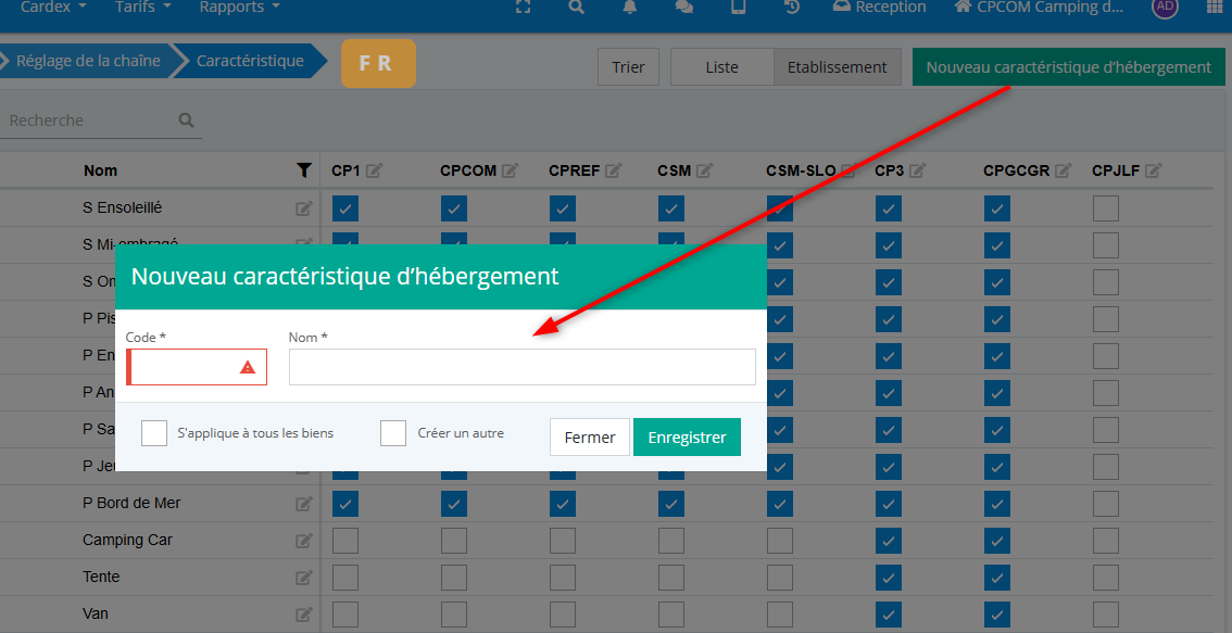 Une fois les caractéristiques créées, elles peuvent être associées à chaque hébergement.