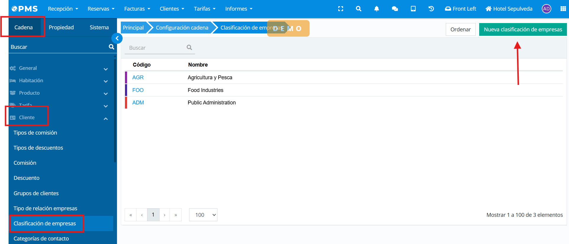 La classification des entreprises est créée au niveau de la chaîne et est visible automatiquement par tous les établissements. Pour créer de nouvelles classifications d'entreprises, nous irons dans Classification des entreprises dans le menu de configuration de la chaîne et créerons une Nouvelle classification d'entreprises.