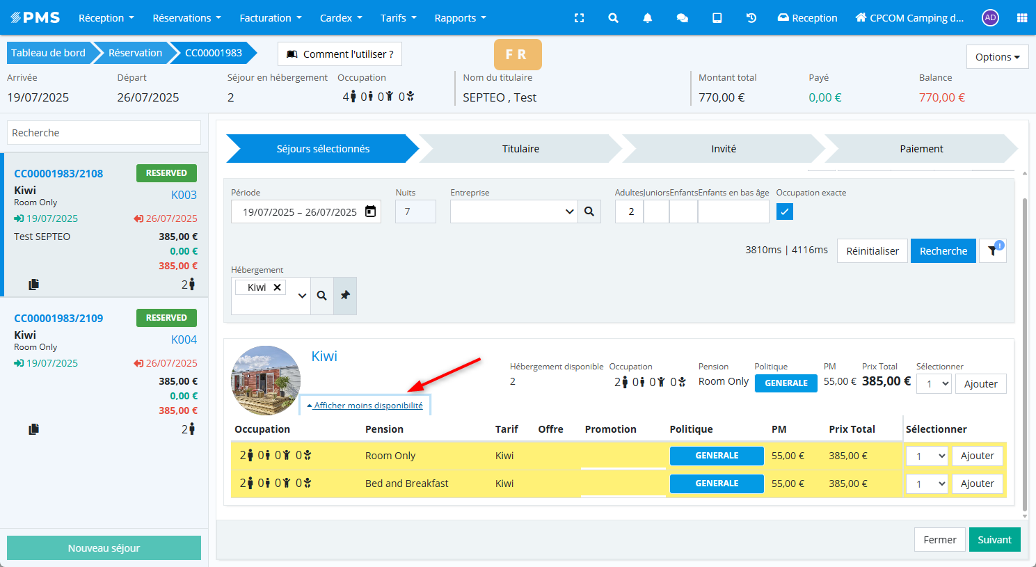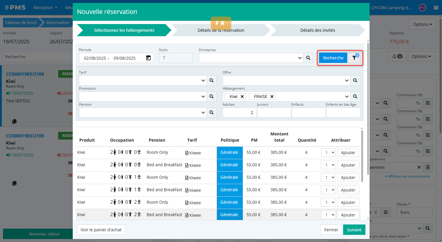 Lancez une recherche de disponibilité en cliquant sur Rechercher.