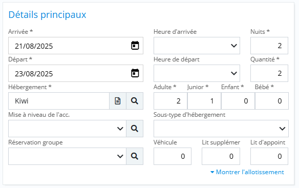 Lorsque l’occupation renseignée dépasse l’occupation maximale standard de l’hébergement, Ulyses Suite gère automatiquement l’ajout des équipements nécessaires, tels que les lits supplémentaires ou les lits bébé, en fonction de la configuration de l’hébergement.
