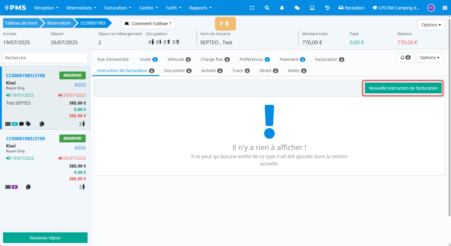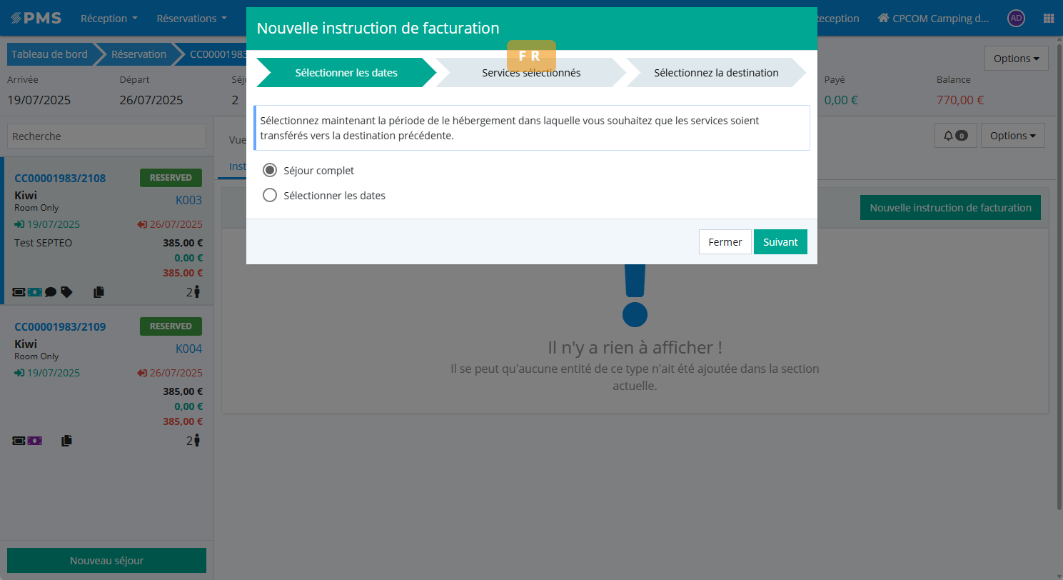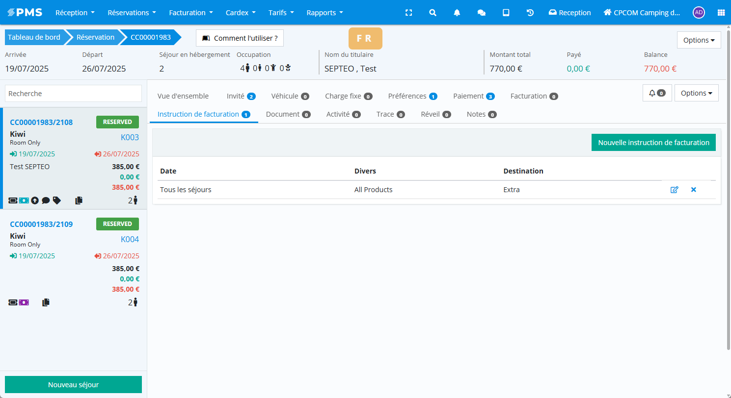 Un seul folio règle l’ensemble des charges d’une réservation multi-séjours.