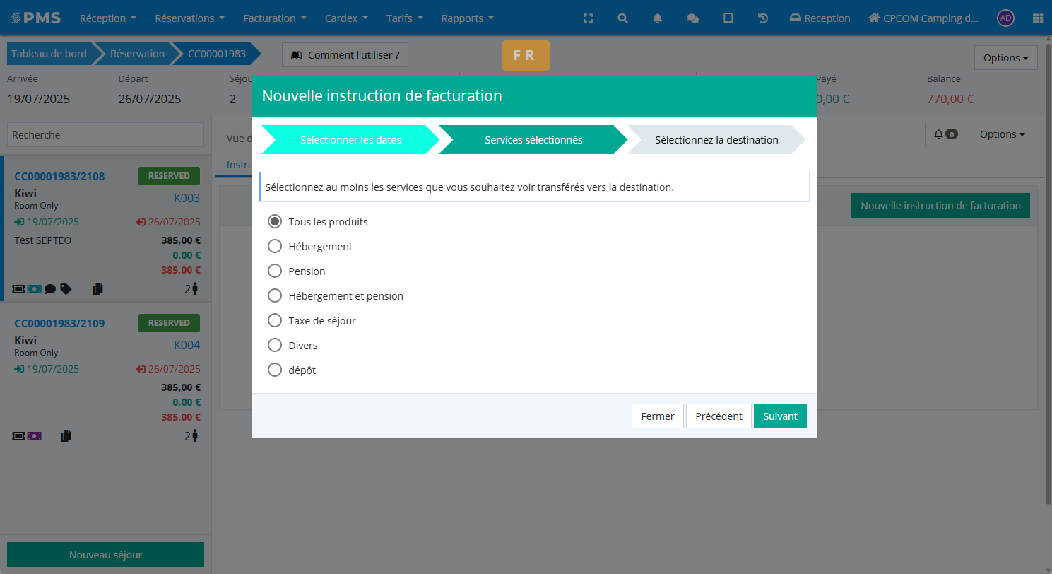 Le routage des charges, également appelé automatisation de facturation, permet de rediriger tout ou partie des charges d’un séjour vers les folios d’autres séjours ou vers un folio spécifique de la réservation.
