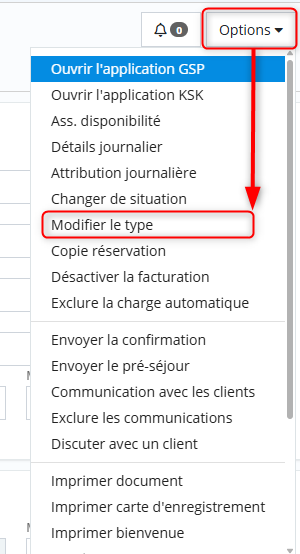 Réservation > Fiche de réservation > Sélectionner séjour > Options > Changer le type de réservation