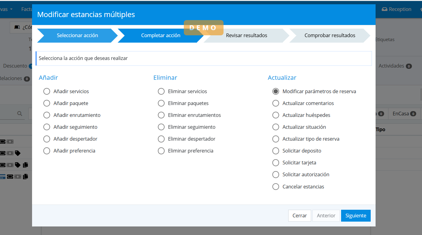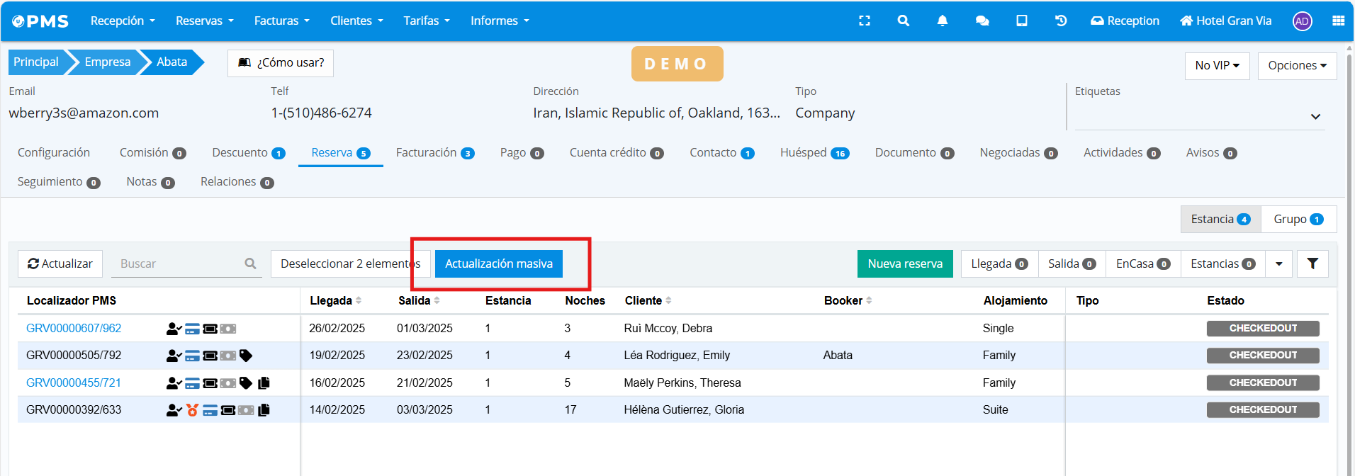 Nous pourrons effectuer une modification massive des réservations via l'option Mise à jour massive.