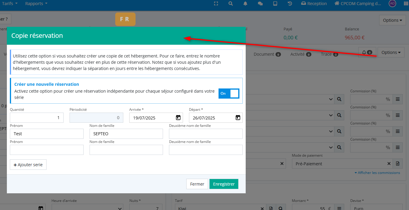 Une série de séjour consiste à copier le séjour sélectionné et à créer plusieurs répliques, soit dans la même réservation, soit sous forme de nouvelles réservations.