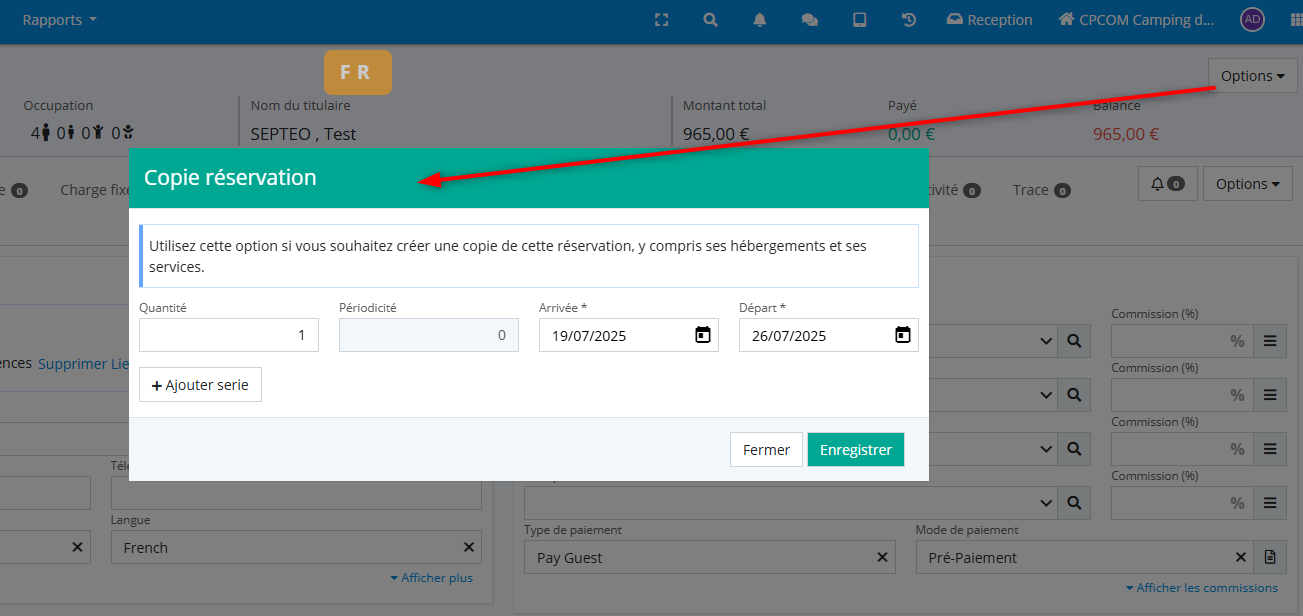Fiche de réservation>Options>Copie réservation