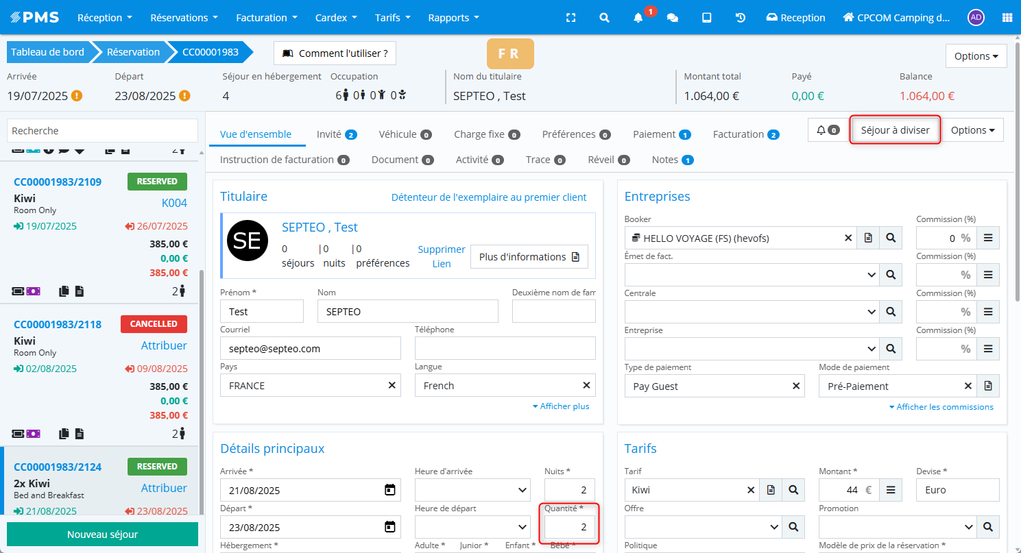 La division s’effectue depuis la fiche de la réservation, au niveau du séjour concerné.