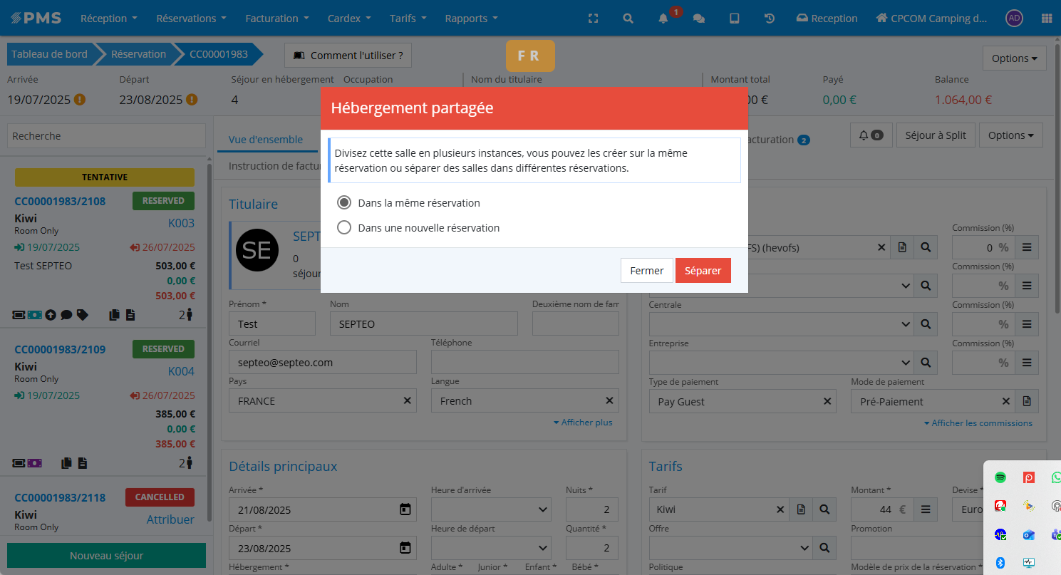 Divisez la réservation avant d’attribuer les hébergements ou de lancer la facturation afin d’éviter des ajustements supplémentaires par la suite.