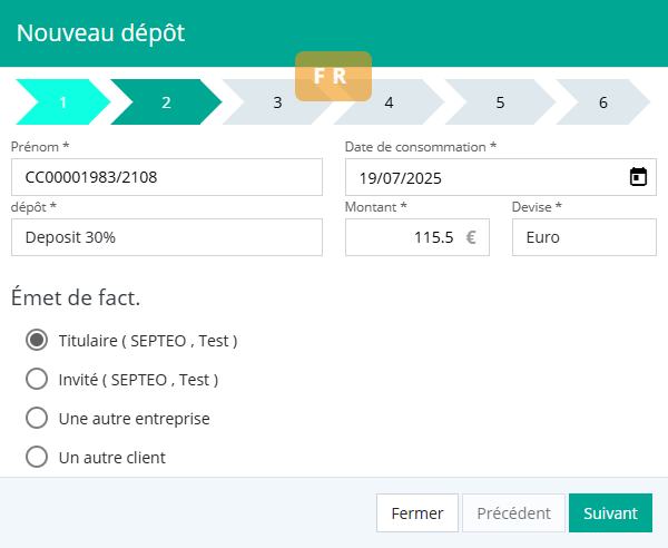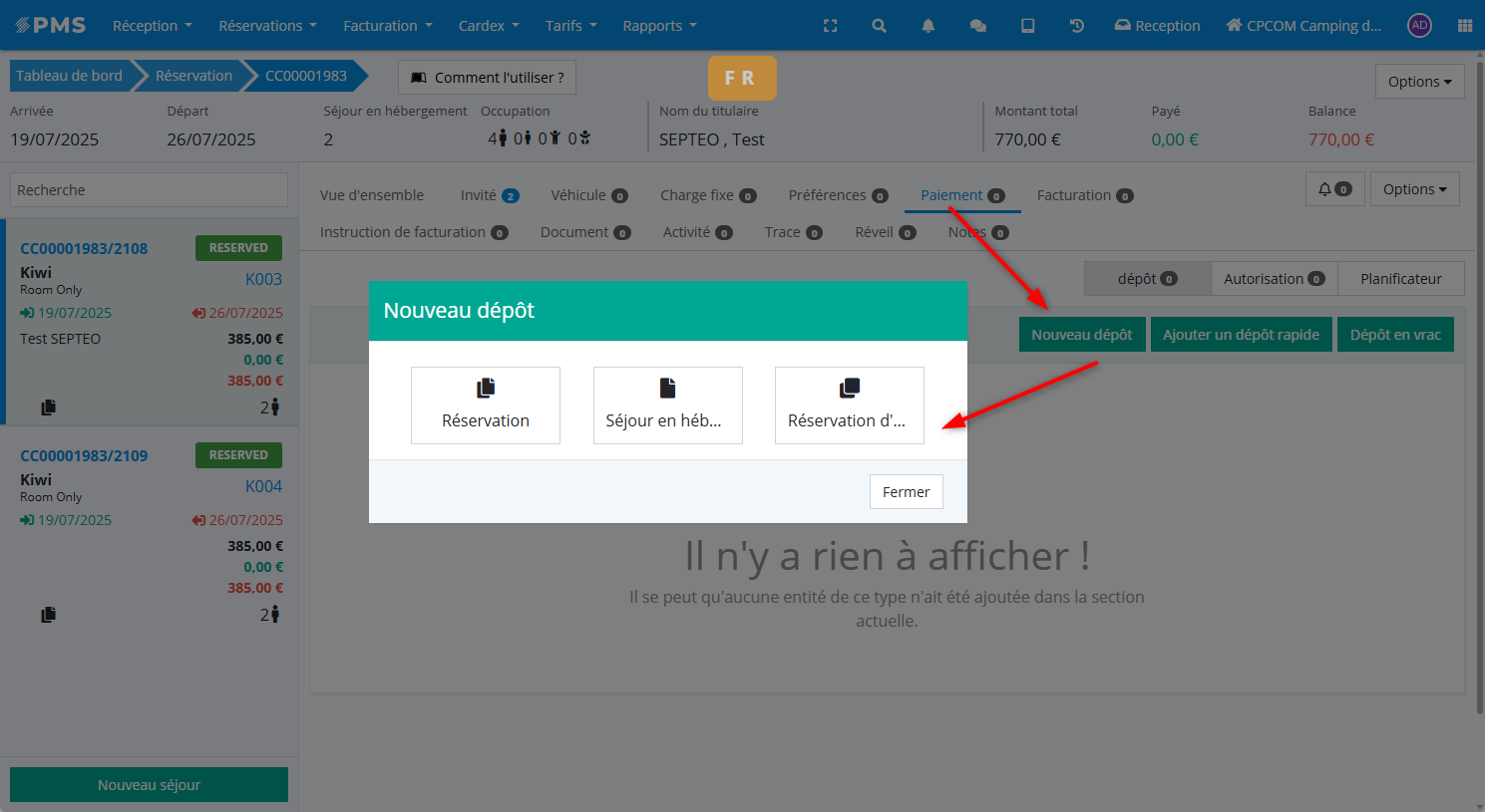 Fiche de réservation > Sélectionner le séjour > Onglet Paiements > Nouveau dépôtDepuis la gestion des dépôts