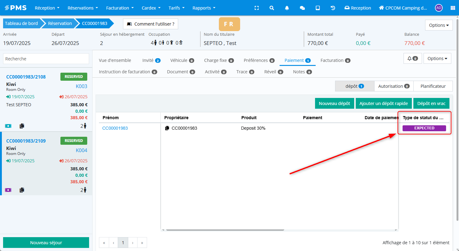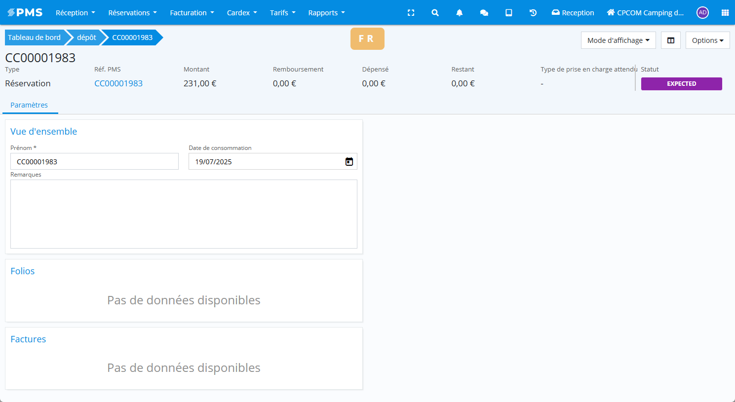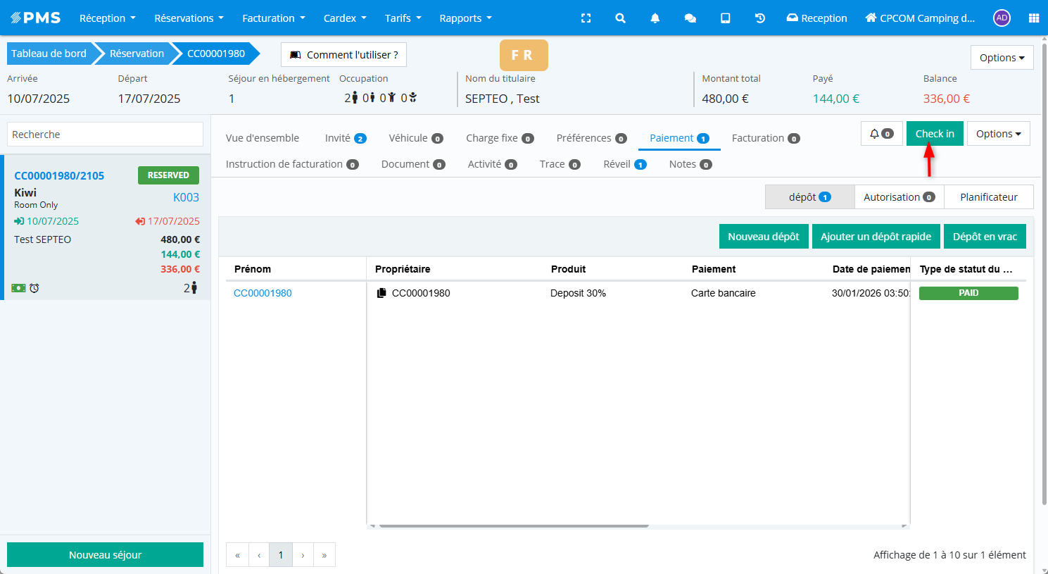 Une fois créé, le dépôt est automatiquement appliqué sur le folio principal de la réservation après le check-in.