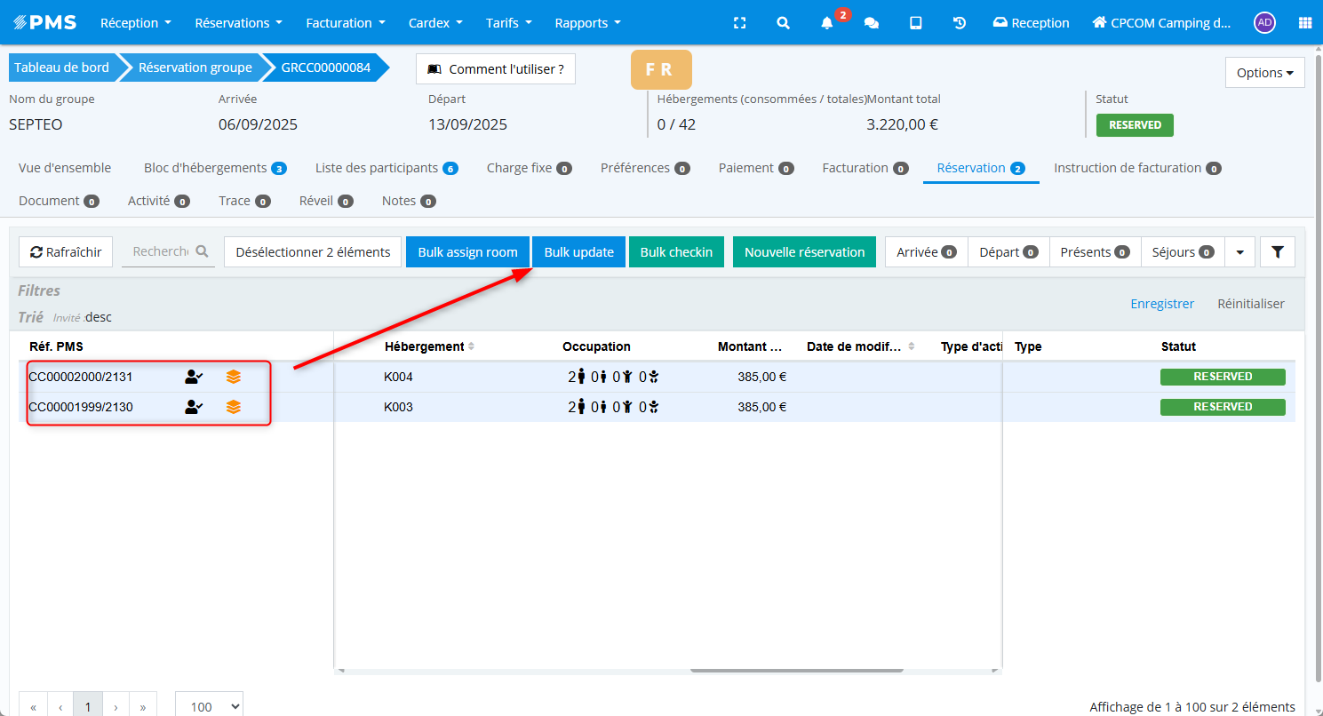 Fiche réservation de groupe > Onglet Séjours > Bulk update