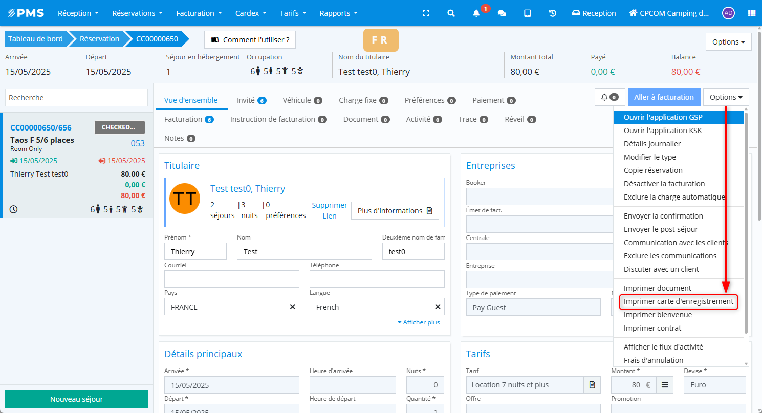 Fiche des réservations > Sélectionner le séjour > Options > Imprimer la carte d’enregistrement