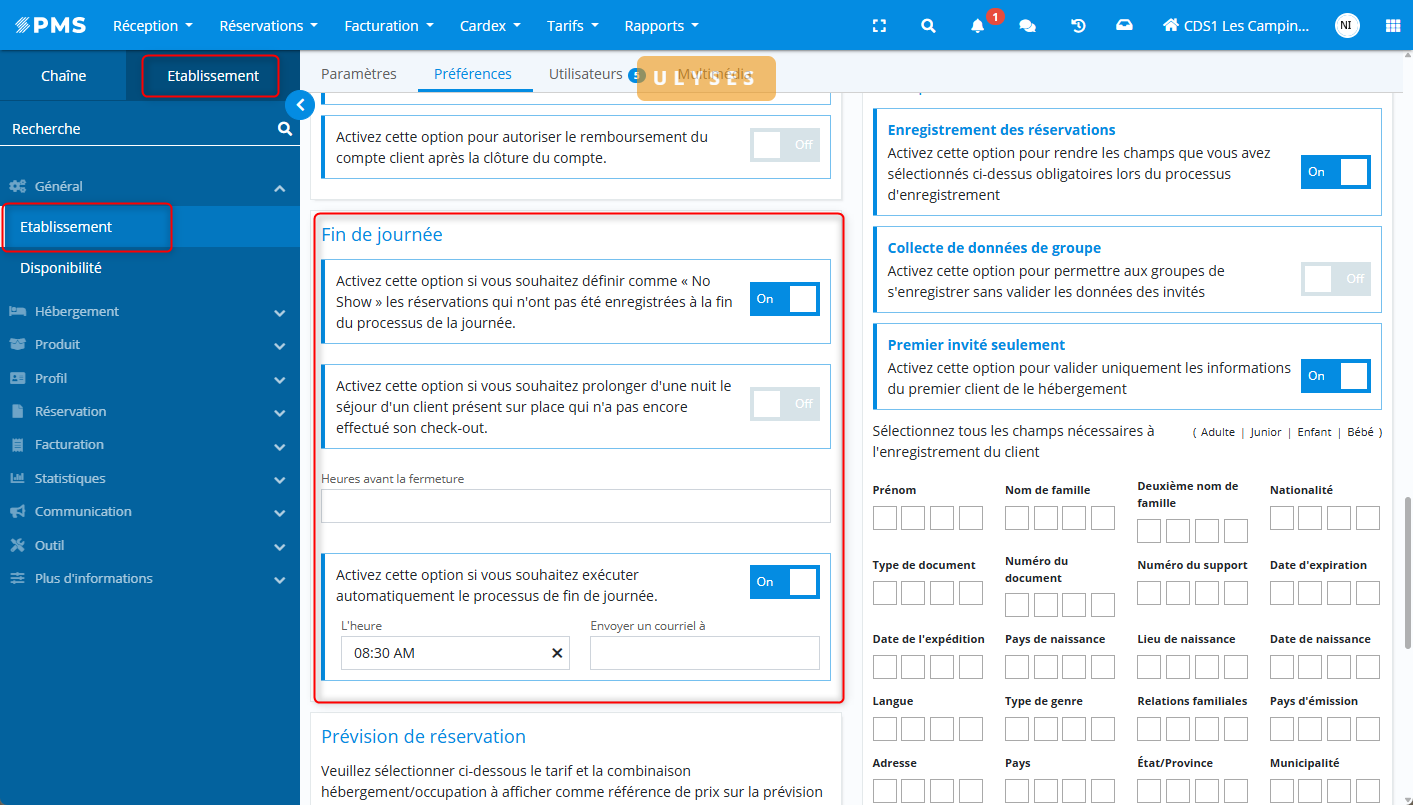 Cette étape finalise l’ensemble des actions précédentes. Elle met à jour les prévisions de réservations, l’état futur de l’établissement et applique les traitements nécessaires à la clôture journalière. - Rapports d’urgence