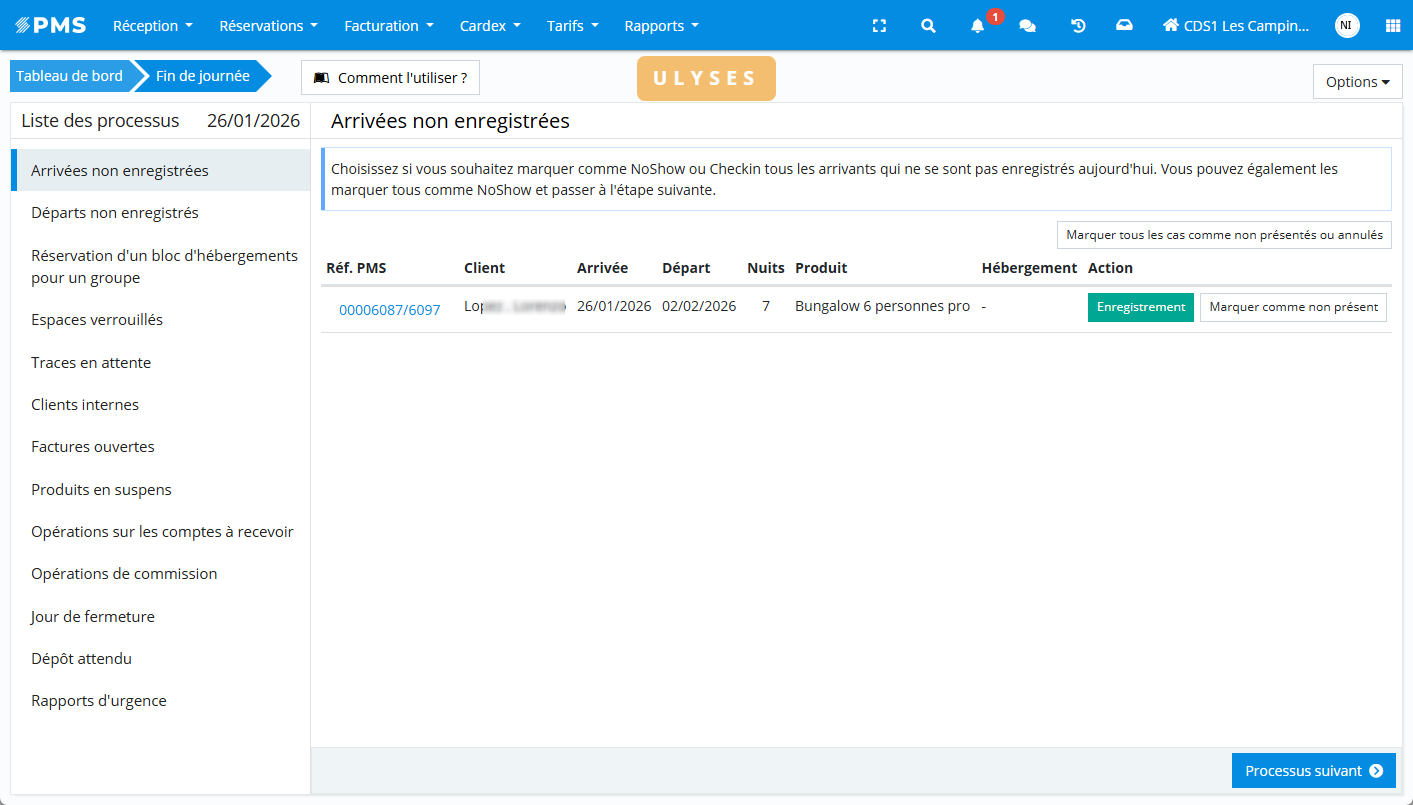 Ulyses Suite identifie les réservations pour lesquelles un enregistrement aurait dû être effectué mais ne l’a pas été. À cette étape, vous devez décider de marquer ces réservations comme No-show et d’appliquer les frais correspondants, ou de choisir une autre action selon la situation. - Départs sans check-out