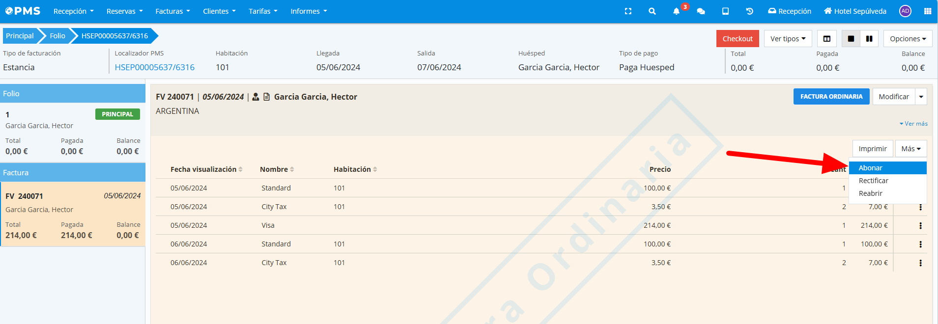Une fois le processus terminé, nous verrons qu'à gauche apparaîtra une nouvelle ligne avec le nouveau numéro de facture et les montants (en négatif dans l'exemple car il s'agit d'une facture d'abonnement).