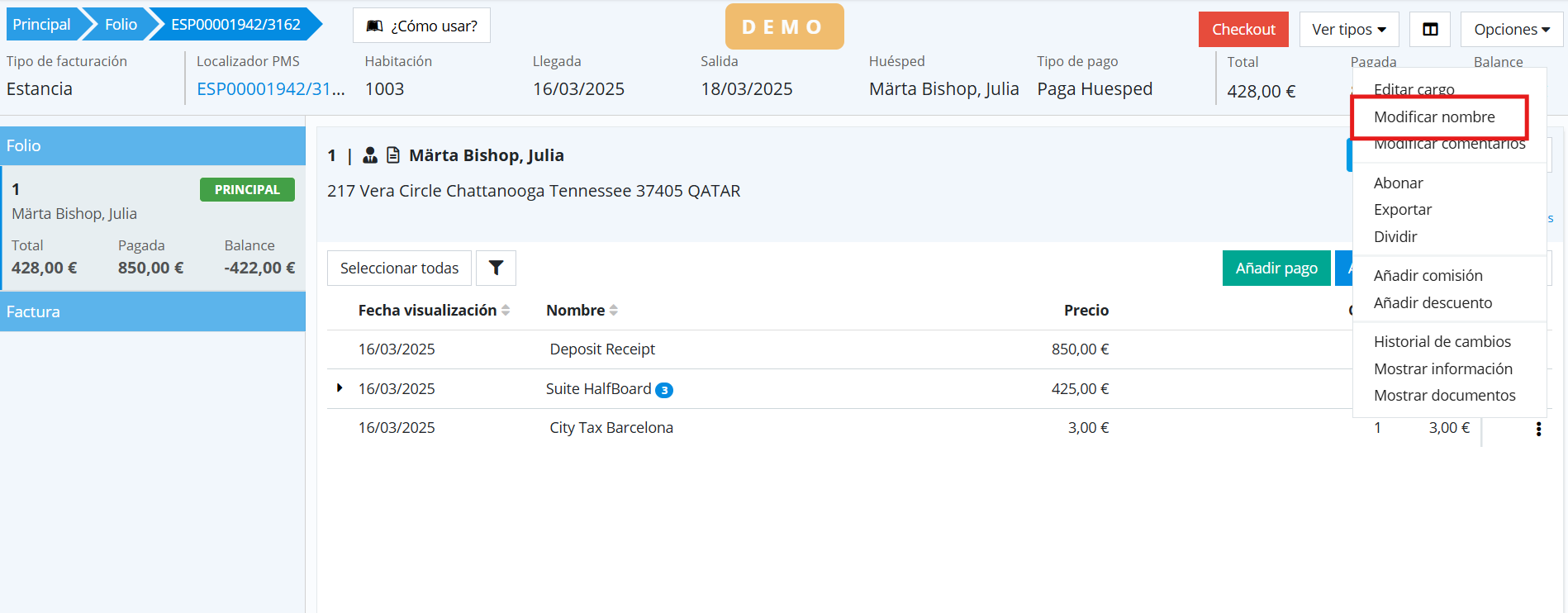 Dans l'exemple suivant, nous voyons comment le dernier poste "City Tax Barcelona" sera modifié en "Tasa turística Barcelona"