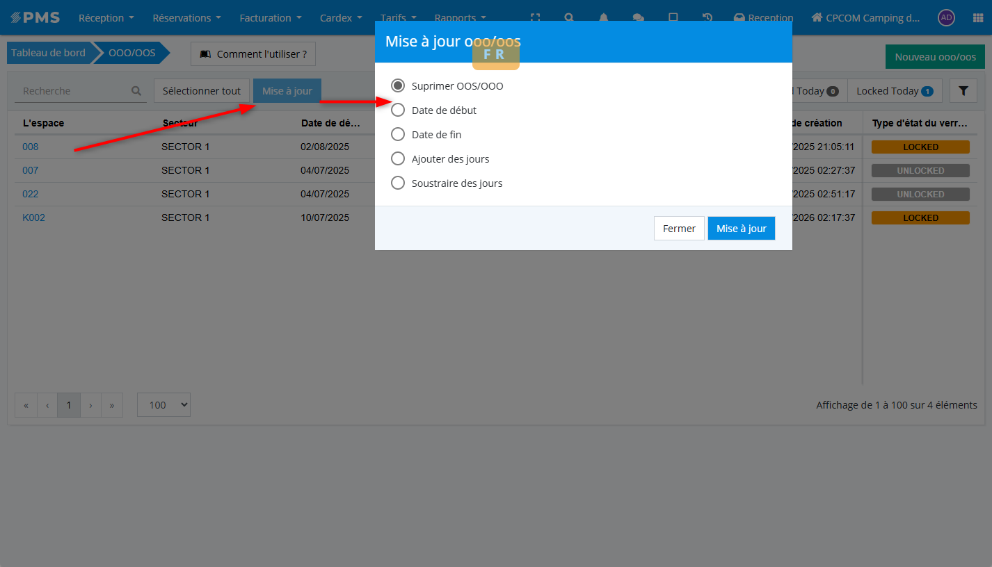 utiliser l’option Déverrouiller depuis le panneau latéral du Plan hébergement ou du planning des réservations,