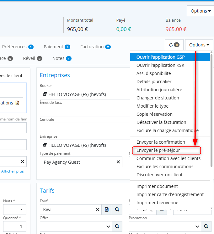 L’email de pré-séjour peut être envoyé manuellement pour les séjours dont l’état est Réservé.