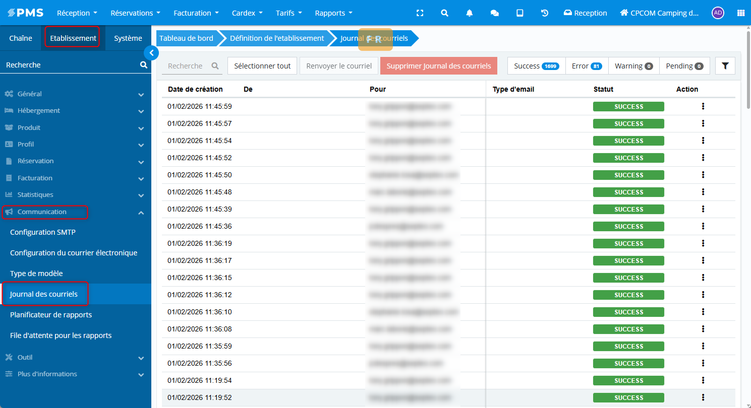 Comme pour le pré-séjour, l’historique des emails envoyés est accessible depuis le journal des emails.