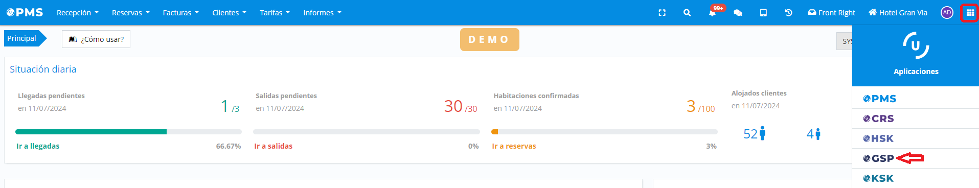 Pour activer le portail client Ulyses GSP, une configuration préalable est nécessaire. Pour cela, nous nous rendrons dans la liste des applications dans le menu supérieur :