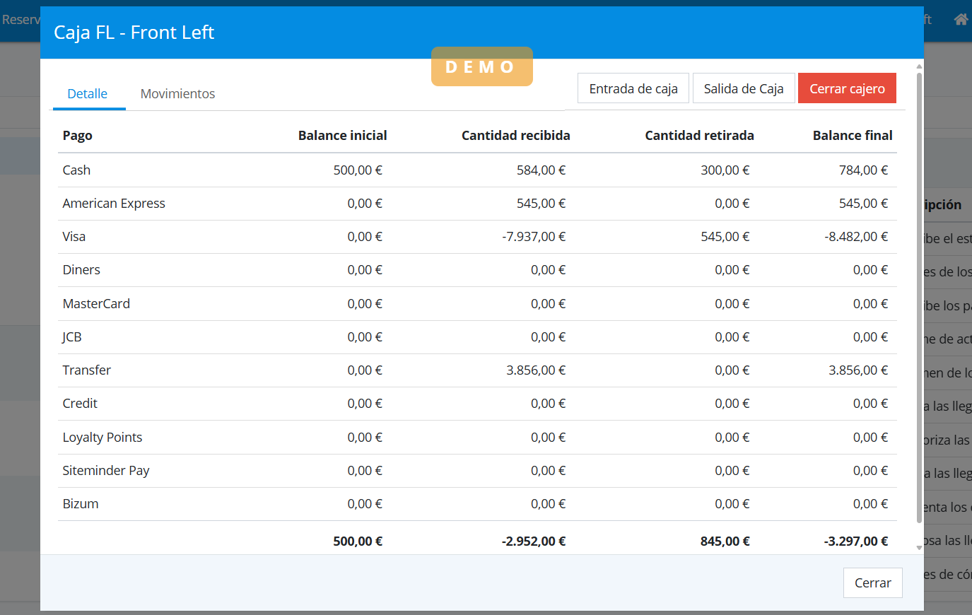 - L'onglet Détail affiche le résumé de tous les mouvements effectués pour chaque mode de paiement. Chaque fois qu'un paiement est saisi dans un folio, qu'un Pay in ou un Pay out est réalisé, cela se matérialisera ici.