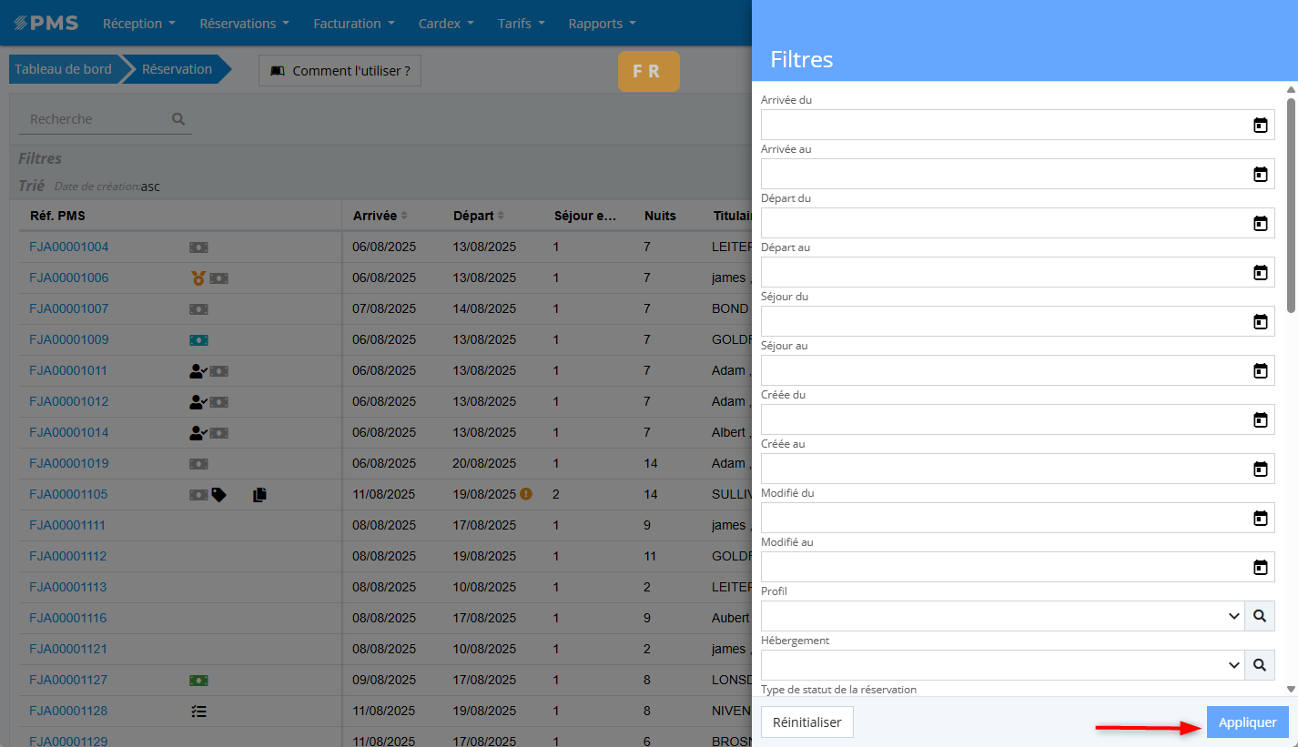 Les filtres personnalisés sont particulièrement utiles pour le suivi régulier des arrivées, des départs, des annulations ou des No-show.