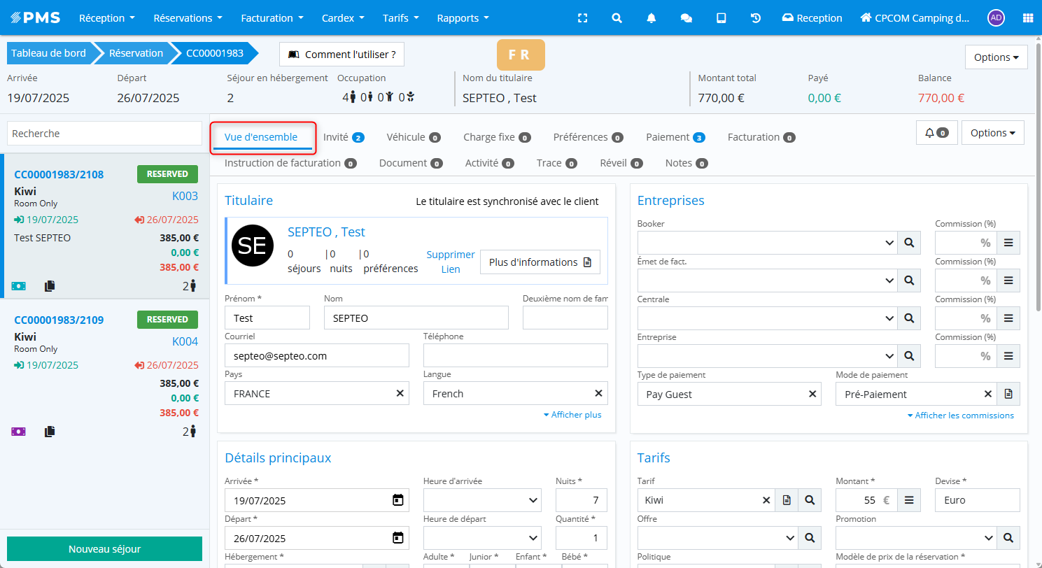 L’onglet Vue d'ensemble d’un séjour regroupe l’ensemble des informations liées à un séjour spécifique au sein d’une réservation.
