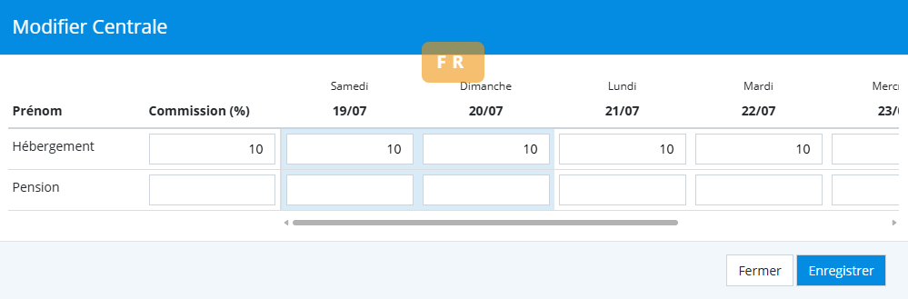 En cliquant sur l’icône de modification , il est possible d’ajuster les commissions appliquées à l’hébergement ou aux services.