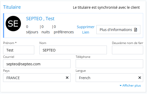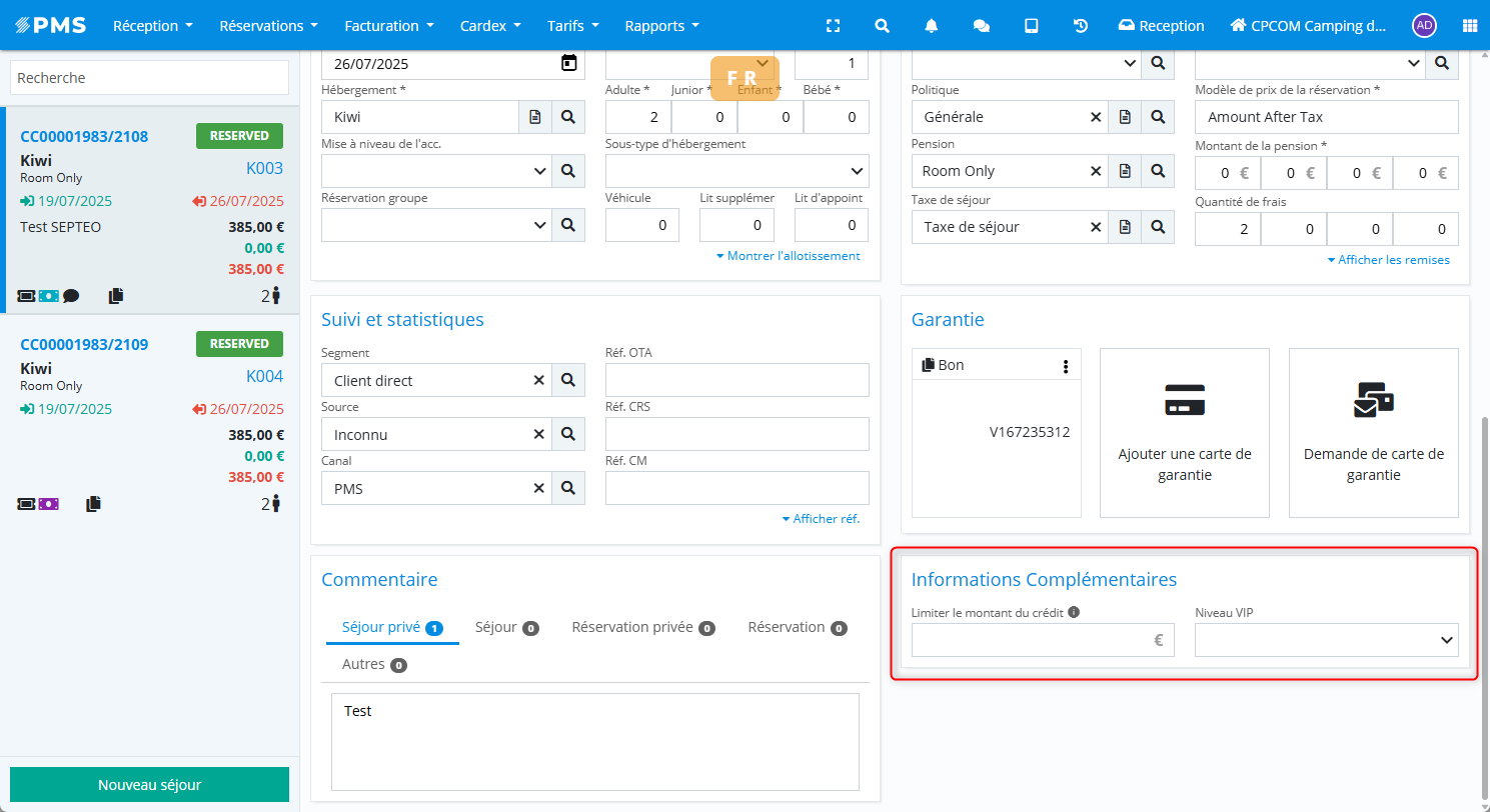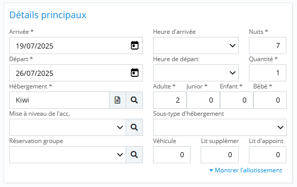 L’onglet Détail concerne toujours le séjour sélectionné, même dans une réservation multi-séjours.