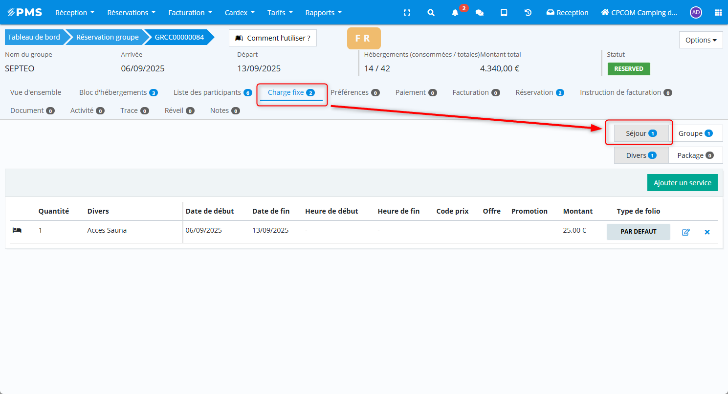 Les services de séjour sont des services qui seront appliqués individuellement à chaque séjour une fois les séjours générés à partir du groupe.