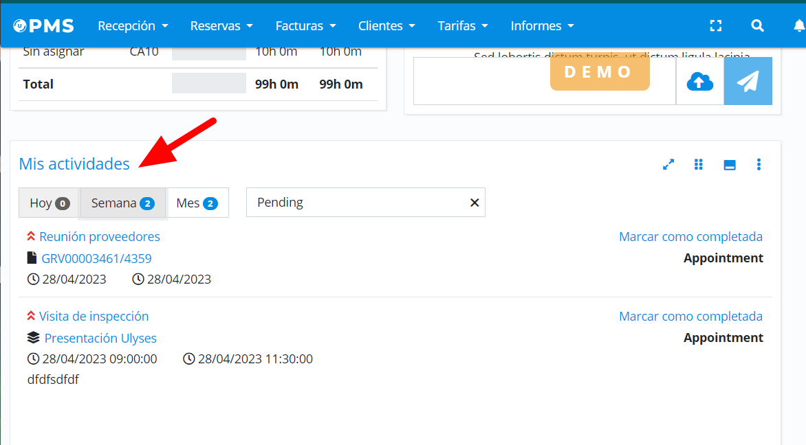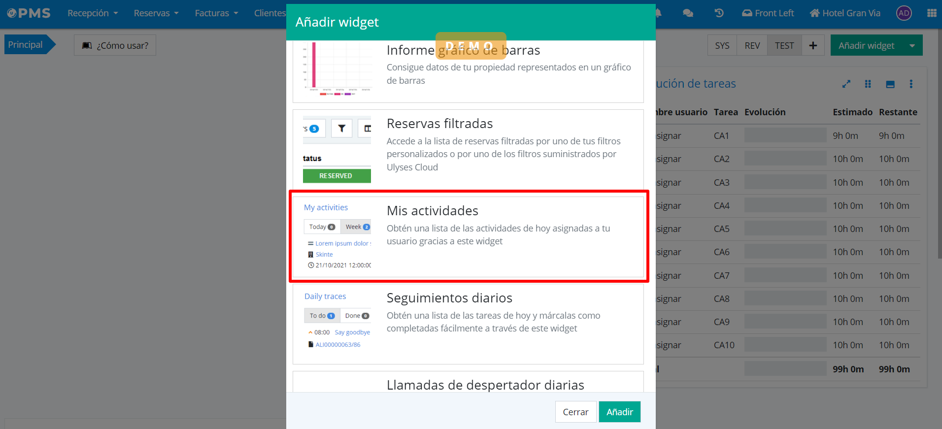Nous pouvons ajouter le widget "Mes activités" à l’un des onglets principaux du PMS.