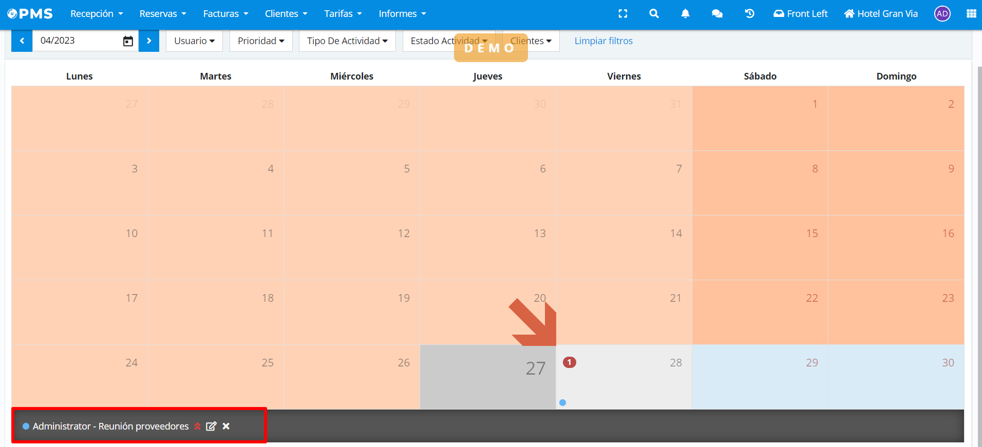 Selon les filtres sélectionnés en haut, le calendrier affichera un nombre déterminé d’activités. En cliquant sur une activité spécifique, un résumé de celle-ci s’affichera et vous aurez la possibilité de la modifier ou de la supprimer en cliquant sur les icônes correspondantes.