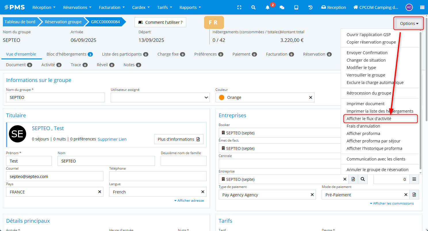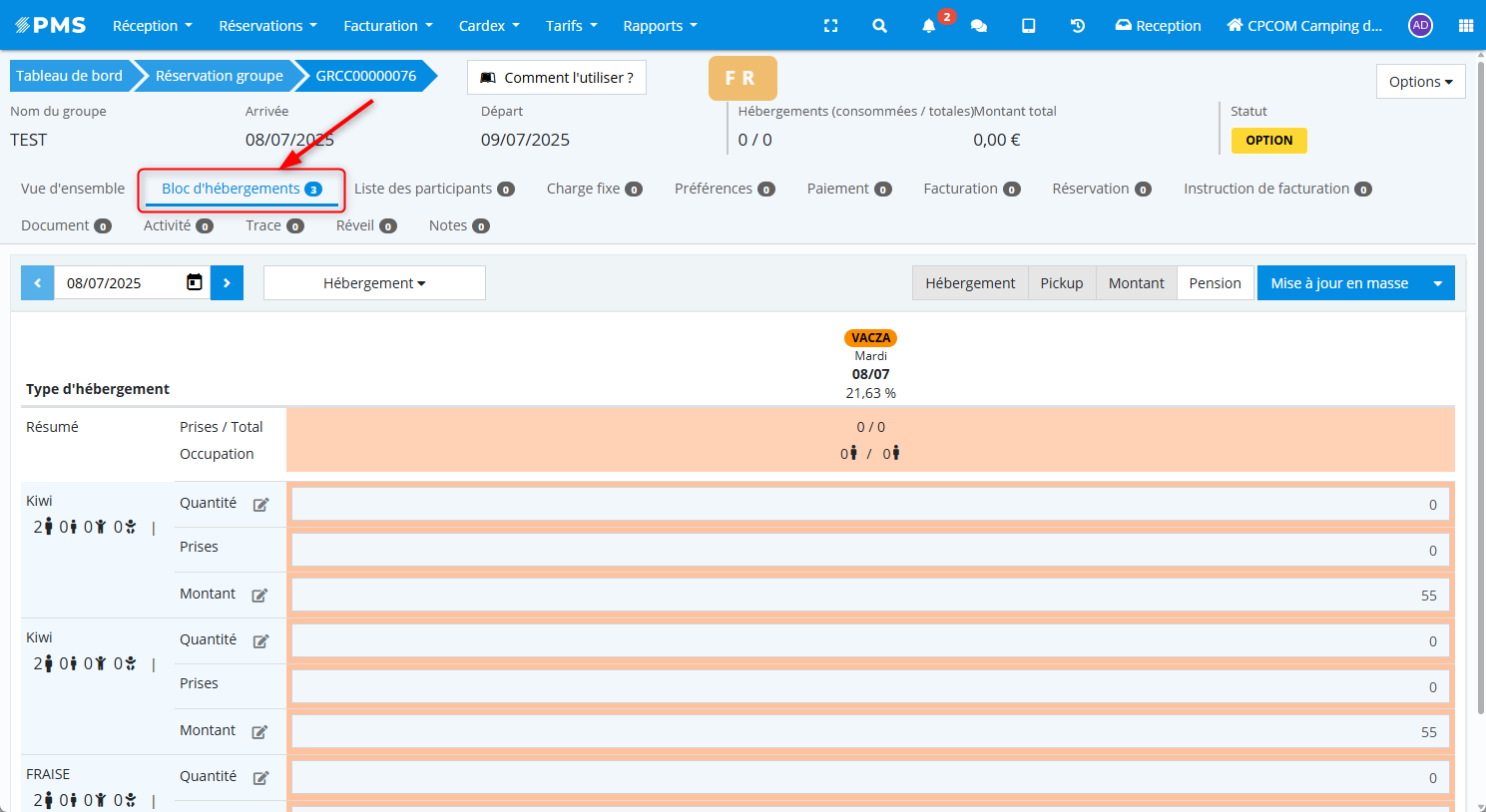 Le blocage est géré depuis la réservation de groupe, dans l’onglet dédié au blocage.
