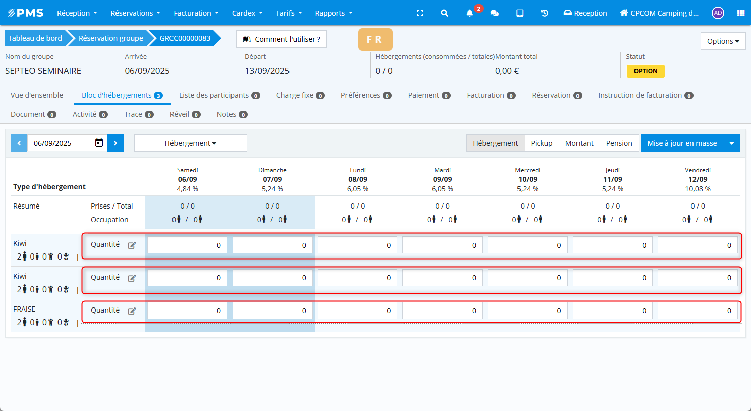 Pour définir le nombre d’hébergements nécessaires chaque jour, il suffit de renseigner la valeur dans le champ Quantité pour chaque typologie.