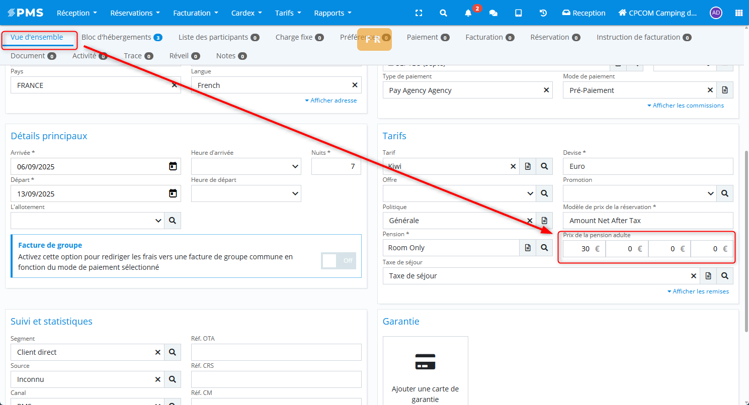Si aucun prix spécifique n’est défini pour la pension, le système applique le prix issu du tarif, de l’offre ou de la promotion configurée.