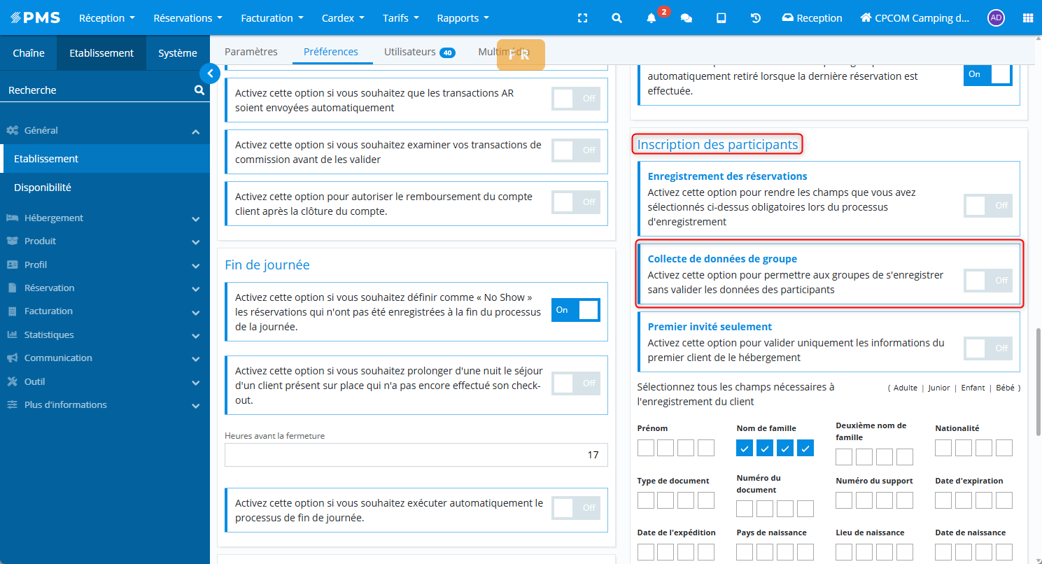 Configuration de la propriété > Propriété > Onglet Préférences > Section Enregistrement des participants
