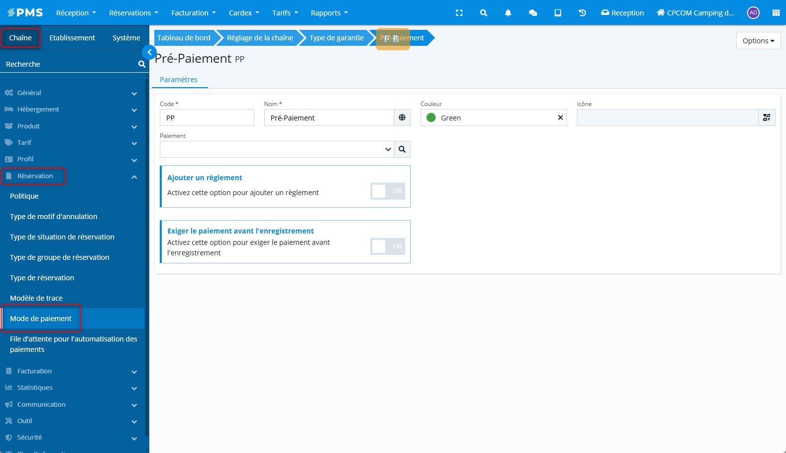 Dans une réservation, il est possible de sélectionner le mode de paiement applicable afin de déterminer :