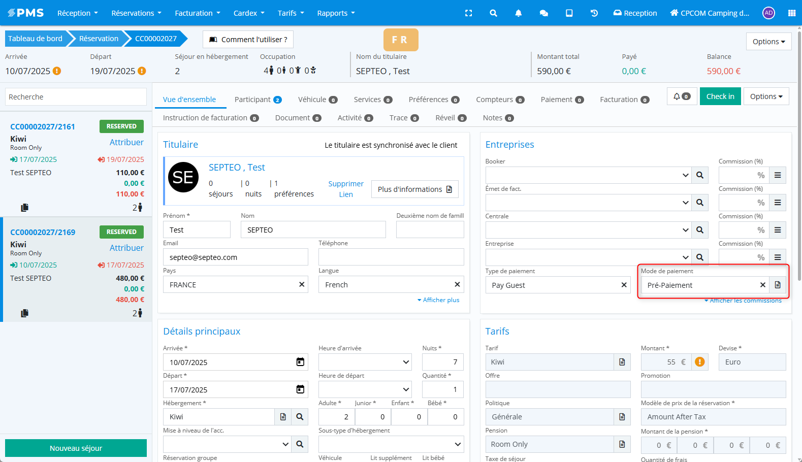 Depuis la fiche d’une réservation, il est possible de sélectionner ou modifier le mode de paiement.