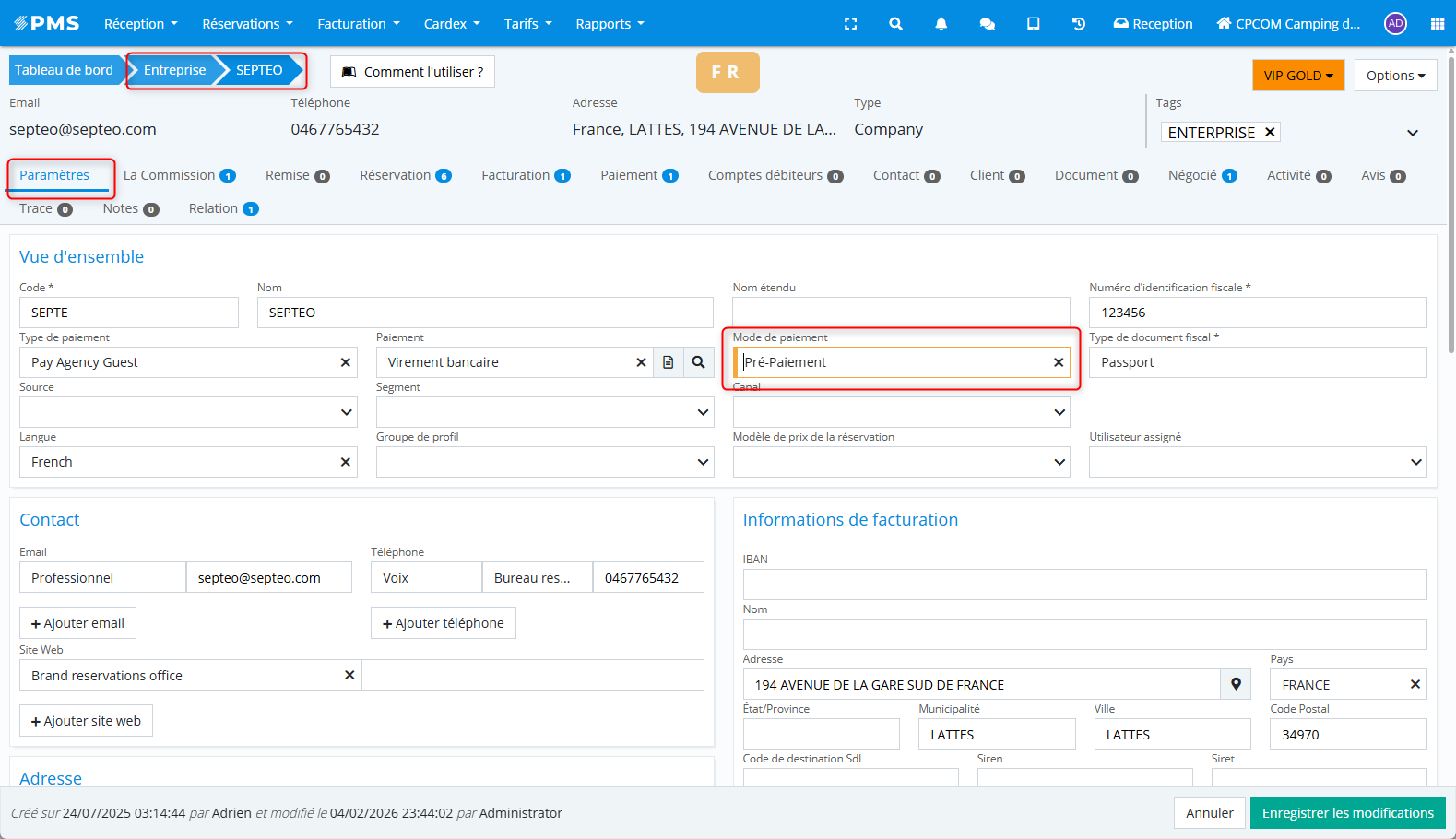 les réservations associées à cette entreprise héritent automatiquement du mode de paiement configuré